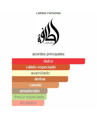 Khamrah de Lattafa Perfumes es una fragancia de la familia olfativa Aromática Especiada para Hombres y Mujeres. Esta fragrancia es nueva. Khamrah se lanzó en 2022. Las Notas de Salida son canela, nuez moscada y bergamota; las Notas de Corazón son dátiles, praliné, nardos y Mahonial; las Notas de Fondo son vainilla, haba tonka, Amberwood, mirra, benjuí y Akigalawood...