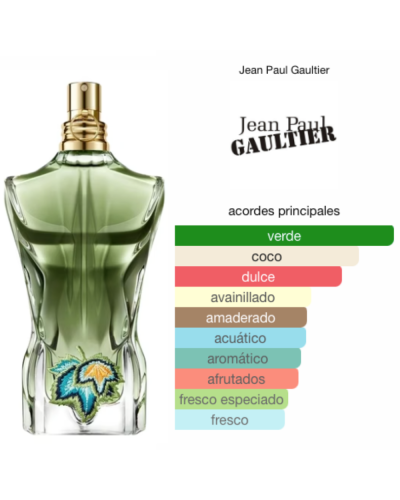 ✨ LE BEAU PARADISE GARDEN – Jean Paul Gaultier – 125ml ✨ 🌴 Aroma: Una fragancia verde y exótica que mezcla notas frescas, coco tropical y acordes amaderados, con un toque dulce y especiado. Es vibrante, seductora y muy elegante, perfecta para un hombre que quiere destacar con un aire sofisticado y aventurero. 💚 Ideal para: Hombres que buscan un perfume distintivo para el día o la noche, con frescura tropical y sensualidad elegante. 🔝 Presentación: Frasco icónico en forma de torso masculino, en tono verde translúcido, con detalles dorados y un diseño único que refleja la esencia del paraíso.