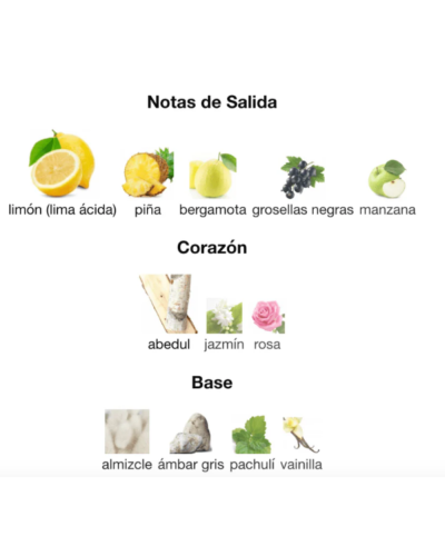Notas de Salida: 🍋 Limón, Piña 🍍, Bergamota, Grosellas Negras y Manzana 🍏. Notas de Corazón: ❤️ Abedul, Jazmín y Rosa 🌹. Notas de Base: 🪵 Almizcle, Ámbar Gris, Pachulí y Vainilla 🍦.