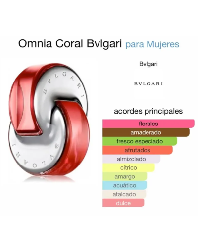 Omnia Coral de Bvlgari es una fragancia de la familia olfativa Floral Frutal para Mujeres. Omnia Coral se lanz贸 en 2012. La Nariz detr谩s de esta fragrancia es Alberto Morillas. Las Notas de Salida son bergamota y Bayas de Goji; las Notas de Coraz贸n son granada, hibisco (flor de Jamaica, cayena) y nen煤far (lirio de agua); las Notas de Fondo son almizcle y cedro de Virginia..